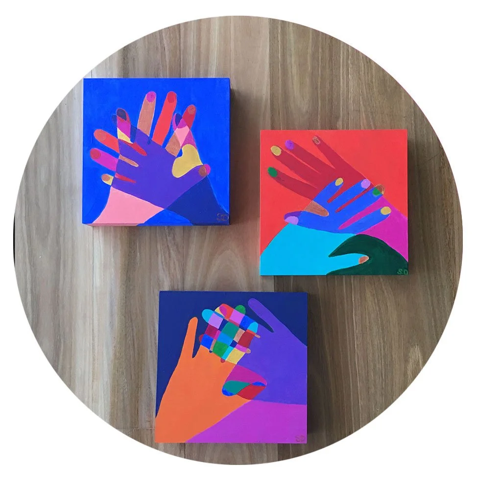 ‘Through the Modernist Window’ - 19 original and limited edition artworks were exhibited at the Sydney Children’s Hospital to bring positive and vibrancy to children, families and staff. Celebrating the love of community and every day moments, interpreted through the Emilio Frank Design lens. Sold works fundraised for the foundation. Hand in Hand triptych was created before Covid 19, however was exhibited during Sydney’s first lockdown. It represented the lack of physical contact we were missing - many families delighted in standing under the hands and taking photographs.